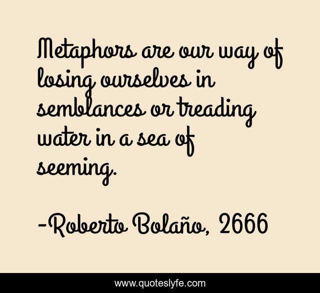 This page presents the quote "Metaphors are our way of losing ourselves in semblances or treading water in a sea of seeming.". Author of this quote is Roberto Bolaño, 2666. This quote is about metaphor, 254,.