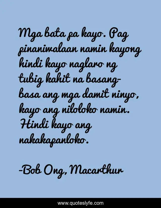 This page presents the quote "Mga bata pa kayo. Pag pinaniwalaan namin kayong hindi kayo naglaro ng tubig kahit na basang-basa ang mga damit ninyo, kayo ang niloloko namin. Hindi kayo ang nakakapanloko.". Author of this quote is Bob Ong, Macarthur. This quote is about enthusiasm, inspirational,.