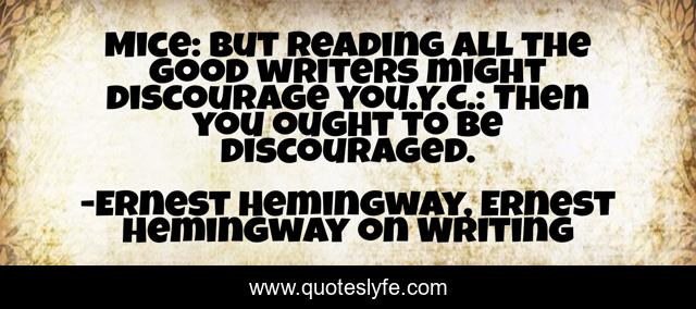 This page presents the quote "Mice: But reading all the good writers might discourage you.Y.C.: Then you ought to be discouraged.". Author of this quote is Ernest Hemingway, Ernest Hemingway on Writing. This quote is about literature, encouragement, writing, writers, reading, skill, writers-on-reading, discouragement,.