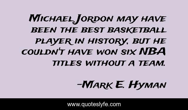 This page presents the quote "Michael Jordon may have been the best basketball player in history, but he couldn't have won six NBA titles without a team.". Author of this quote is Mark E. Hyman. This quote is about basketball, history, team,.
