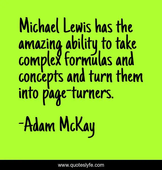 This page presents the quote "Michael Lewis has the amazing ability to take complex formulas and concepts and turn them into page-turners.". Author of this quote is Adam McKay. This quote is about turn, complex, ability,.