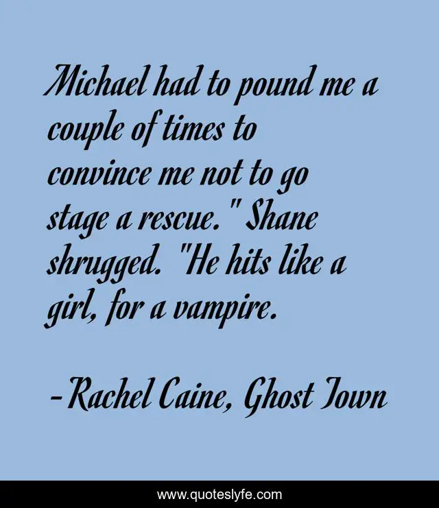 This page presents the quote "Michael had to pound me a couple of times to convince me not to go stage a rescue." Shane shrugged. "He hits like a girl, for a vampire.". Author of this quote is Rachel Caine, Ghost Town. This quote is about shane, humor,.