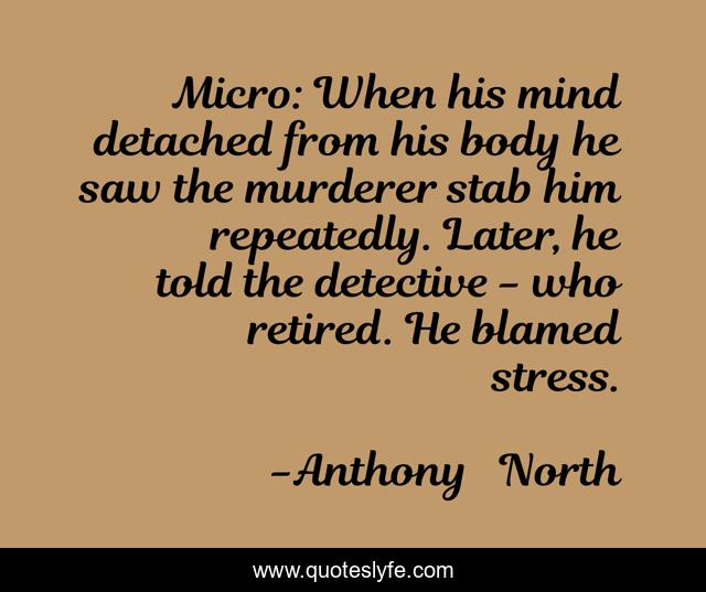This page presents the quote "Micro: When his mind detached from his body he saw the murderer stab him repeatedly. Later, he told the detective - who retired. He blamed stress.". Author of this quote is Anthony North. This quote is about ghost, crime,.