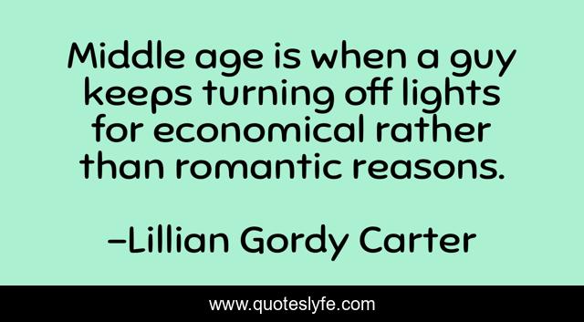 This page presents the quote "Middle age is when a guy keeps turning off lights for economical rather than romantic reasons.". Author of this quote is Lillian Gordy Carter. This quote is about lights, age, guy,.