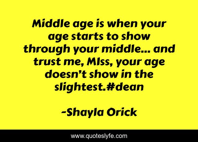 This page presents the quote "Middle age is when your age starts to show through your middle… and trust me, MIss, your age doesn’t show in the slightest.#dean". Author of this quote is Shayla Orick. This quote is about ya, dean, cheeky,.