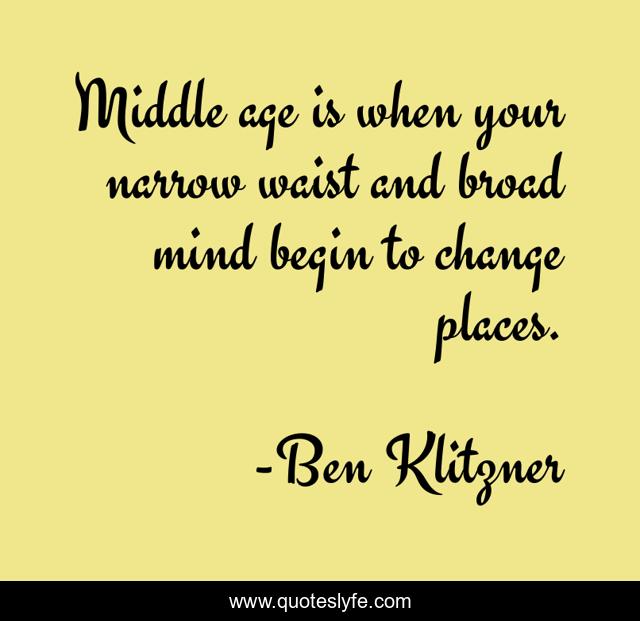 This page presents the quote "Middle age is when your narrow waist and broad mind begin to change places.". Author of this quote is Ben Klitzner. This quote is about age, birthdays,.