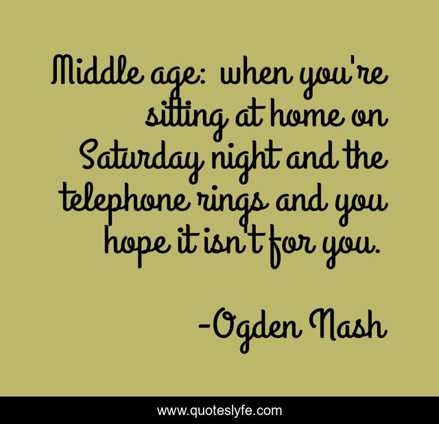 This page presents the quote "Middle age: when you're sitting at home on Saturday night and the telephone rings and you hope it isn't for you.". Author of this quote is Ogden Nash. This quote is about aging, age, old,.