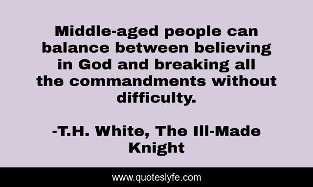 This page presents the quote "Middle-aged people can balance between believing in God and breaking all the commandments without difficulty.". Author of this quote is T.H. White, The Ill-Made Knight. This quote is about discipleship, dissonance, obedience, self-delusion,.
