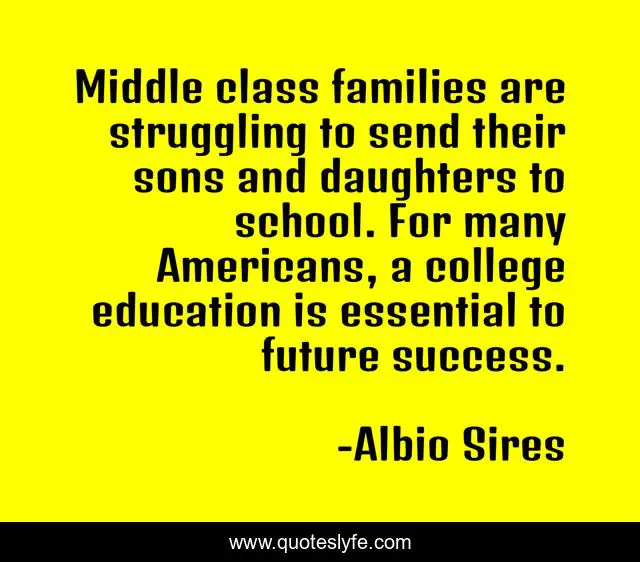 This page presents the quote "Middle class families are struggling to send their sons and daughters to school. For many Americans, a college education is essential to future success.". Author of this quote is Albio Sires. This quote is about school, future, success,.