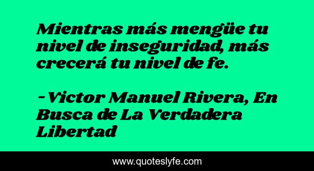 This page presents the quote "Mientras más mengüe tu nivel de inseguridad, más crecerá tu nivel de fe.". Author of this quote is Victor Manuel Rivera, En Busca de La Verdadera Libertad. This quote is about religion, leadership, christian-living,.