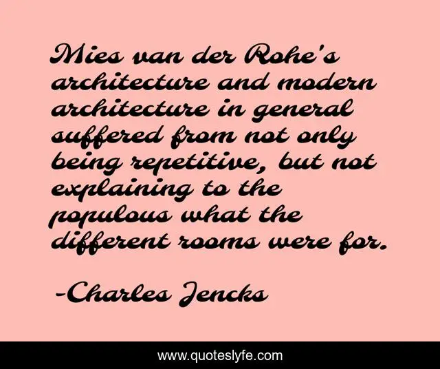 This page presents the quote "Mies van der Rohe's architecture and modern architecture in general suffered from not only being repetitive, but not explaining to the populous what the different rooms were for.". Author of this quote is Charles Jencks. This quote is about being, different, modern,.