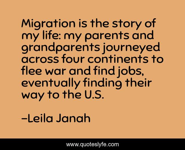 This page presents the quote "Migration is the story of my life: my parents and grandparents journeyed across four continents to flee war and find jobs, eventually finding their way to the U.S.". Author of this quote is Leila Janah. This quote is about life, my life, parents,.