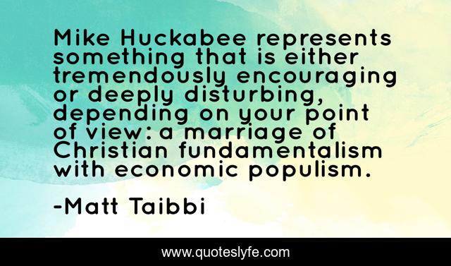 This page presents the quote "Mike Huckabee represents something that is either tremendously encouraging or deeply disturbing, depending on your point of view: a marriage of Christian fundamentalism with economic populism.". Author of this quote is Matt Taibbi. This quote is about point of view, christian,.