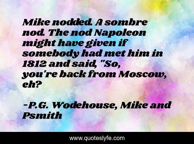 This page presents the quote "Mike nodded. A sombre nod. The nod Napoleon might have given if somebody had met him in 1812 and said, "So, you're back from Moscow, eh?". Author of this quote is P.G. Wodehouse, Mike and Psmith. This quote is about misfortune, sombre-mood, humor,.