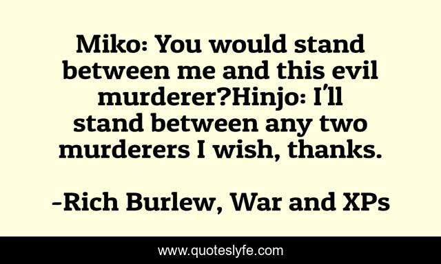 This page presents the quote "Miko: You would stand between me and this evil murderer?Hinjo: I'll stand between any two murderers I wish, thanks.". Author of this quote is Rich Burlew, War and XPs. This quote is about obstacle, murderer, evil,.