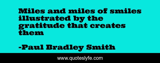 This page presents the quote "Miles and miles of smiles illustrated by the gratitude that creates them". Author of this quote is Paul Bradley Smith. This quote is about gratitude, smiles, life, grateful, happiness,.