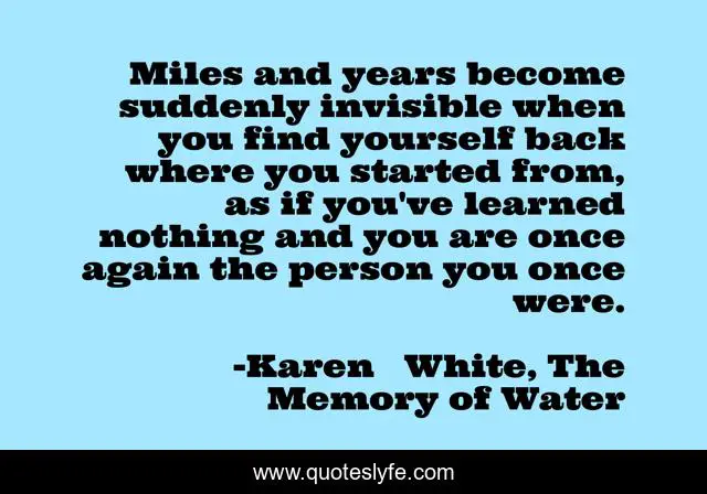 "Karen White, The Memory of Water Quotes." Quoteslyfe.com, 2025. Fri. 05 Dec. 2025. <https://www.quoteslyfe.com/quote/Miles-and-years-become-suddenly-invisible-when-9492>.