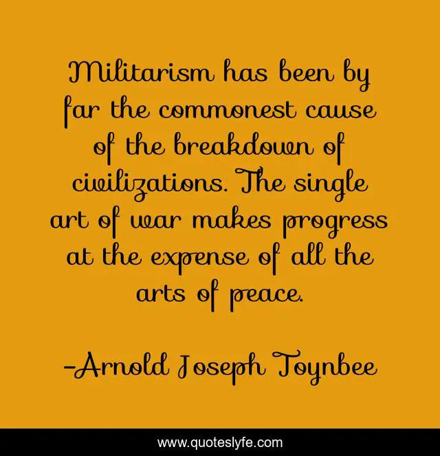 This page presents the quote "Militarism has been by far the commonest cause of the breakdown of civilizations. The single art of war makes progress at the expense of all the arts of peace.". Author of this quote is Arnold Joseph Toynbee. This quote is about peace, history, war, militarism,.