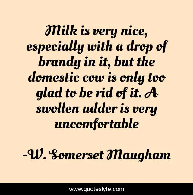 This page presents the quote "Milk is very nice, especially with a drop of brandy in it, but the domestic cow is only too glad to be rid of it. A swollen udder is very uncomfortable". Author of this quote is W. Somerset Maugham. This quote is about life, perspective, people,.