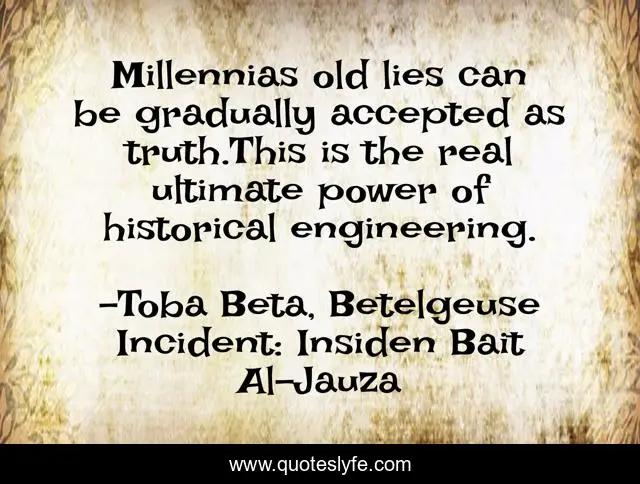 This page presents the quote "Millennias old lies can be gradually accepted as truth.This is the real ultimate power of historical engineering.". Author of this quote is Toba Beta, Betelgeuse Incident: Insiden Bait Al-Jauza. This quote is about historical-engineering, lies, truth,.