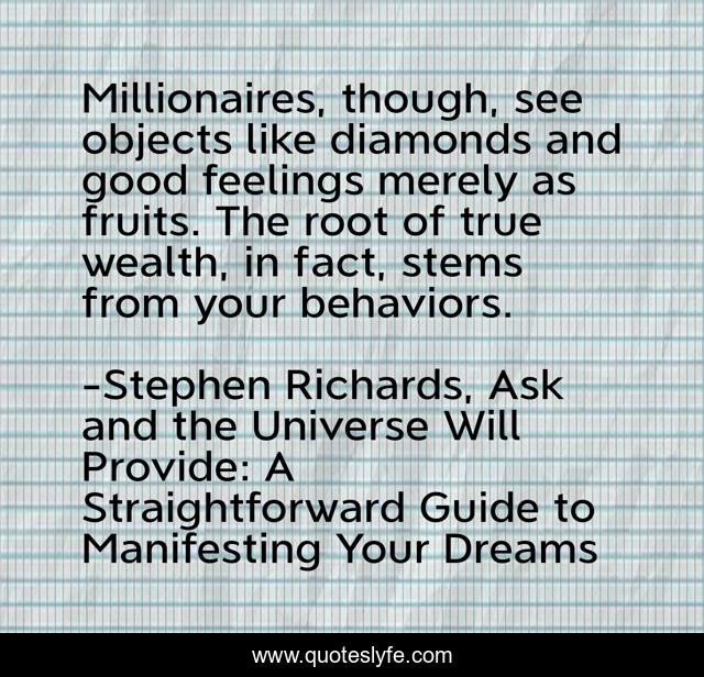 "Stephen Richards, Ask and the Universe Will Provide: A Straightforward Guide to Manifesting Your Dreams Quotes." Quoteslyfe.com, 2026. Sun. 22 Mar. 2026. <https://www.quoteslyfe.com/quote/Millionaires-though-see-objects-like-diamonds-and-44801>.
