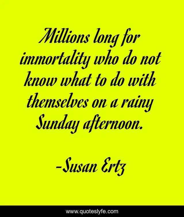 This page presents the quote "Millions long for immortality who do not know what to do with themselves on a rainy Sunday afternoon.". Author of this quote is Susan Ertz. This quote is about day, one,.