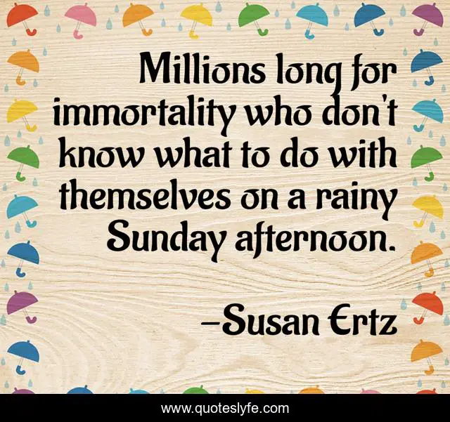 This page presents the quote "Millions long for immortality who don't know what to do with themselves on a rainy Sunday afternoon.". Author of this quote is Susan Ertz. This quote is about rainy, long,.