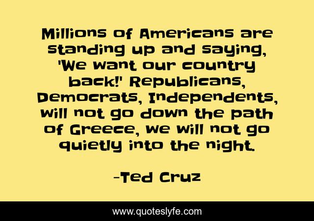 This page presents the quote "Millions of Americans are standing up and saying, 'We want our country back!' Republicans, Democrats, Independents, will not go down the path of Greece, we will not go quietly into the night.". Author of this quote is Ted Cruz. This quote is about path, night,.