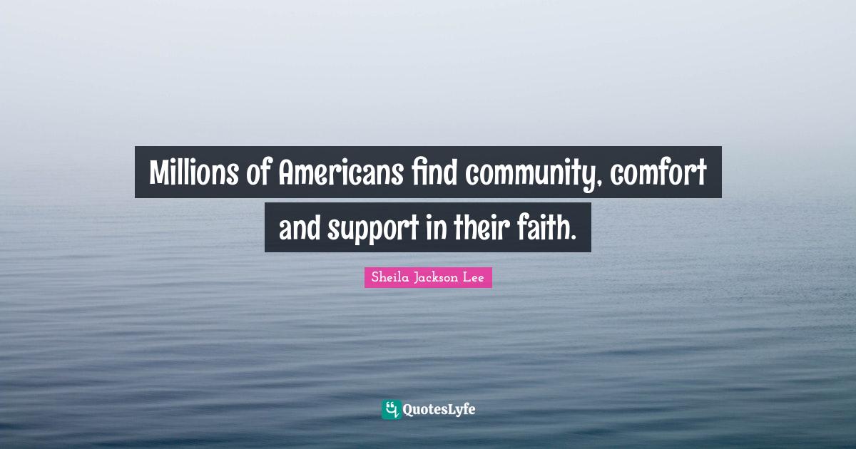 This page presents the quote "Millions of Americans find community, comfort and support in their faith.". Author of this quote is Sheila Jackson Lee. This quote is about support, community, faith, comfort, millions,.