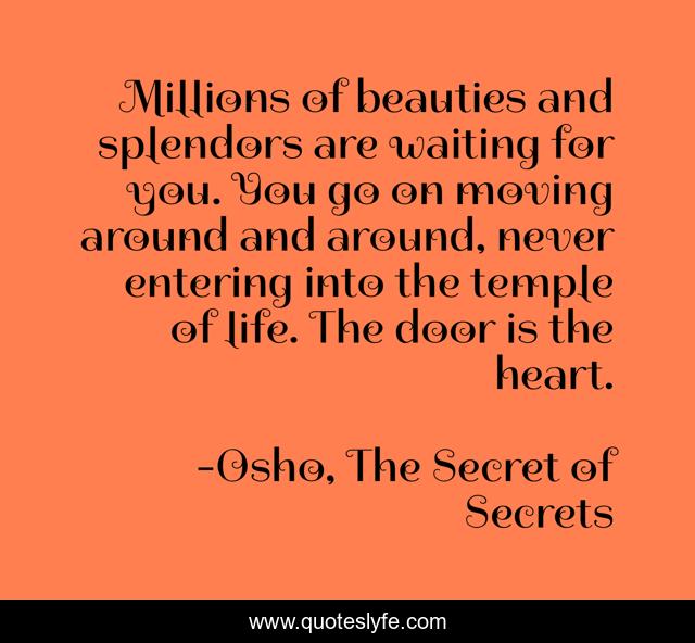 This page presents the quote "Millions of beauties and splendors are waiting for you. You go on moving around and around, never entering into the temple of life. The door is the heart.". Author of this quote is Osho, The Secret of Secrets. This quote is about heart, life, door, temple, beauty,.