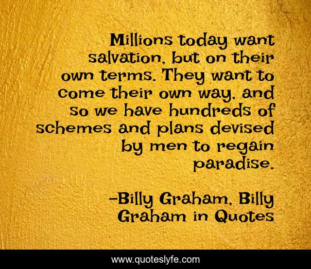This page presents the quote "Millions today want salvation, but on their own terms. They want to come their own way, and so we have hundreds of schemes and plans devised by men to regain paradise.". Author of this quote is Billy Graham, Billy Graham in Quotes. This quote is about salvation, billy-graham,.