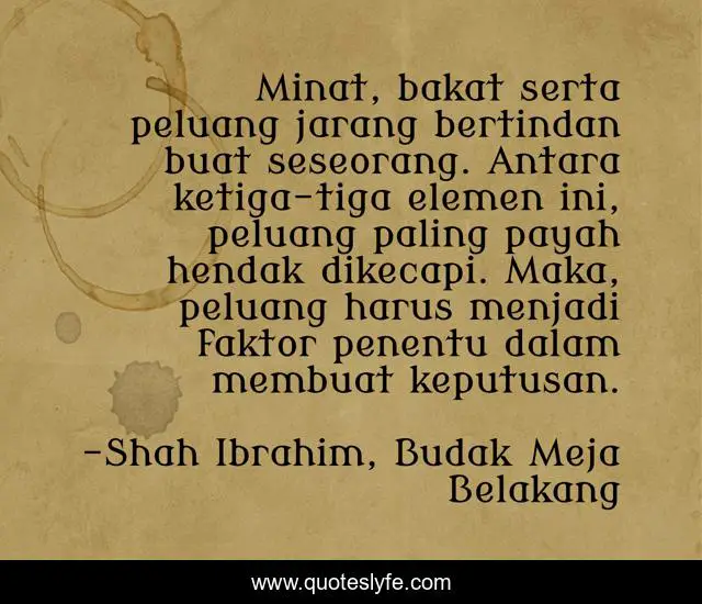 "Shah Ibrahim, Budak Meja Belakang Quotes." Quoteslyfe.com, 2025. Fri. 05 Dec. 2025. <https://www.quoteslyfe.com/quote/Minat-bakat-serta-peluang-jarang-bertindan-buat-14742>.