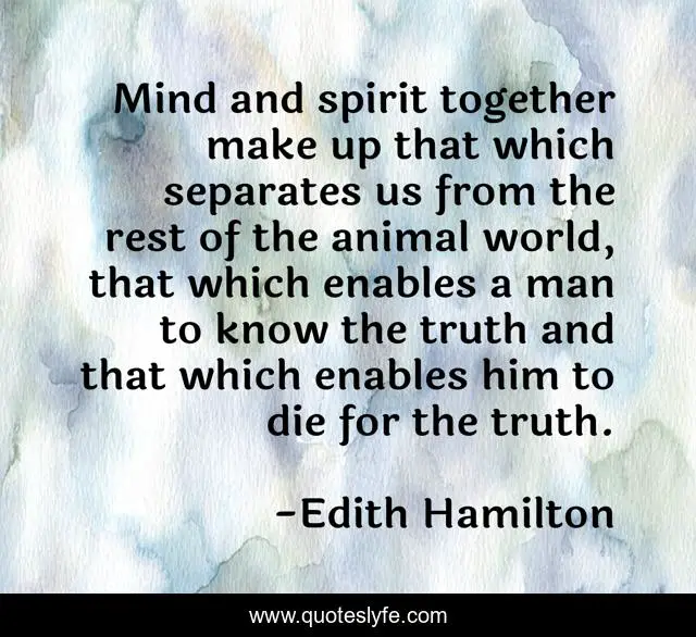 This page presents the quote "Mind and spirit together make up that which separates us from the rest of the animal world, that which enables a man to know the truth and that which enables him to die for the truth.". Author of this quote is Edith Hamilton. This quote is about together, animal, man,.