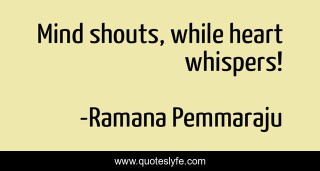 This page presents the quote "Mind shouts, while heart whispers!". Author of this quote is Ramana Pemmaraju. This quote is about heart, life, mind-power,.