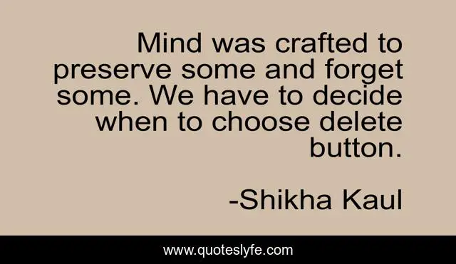 This page presents the quote "Mind was crafted to preserve some and forget some. We have to decide when to choose delete button.". Author of this quote is Shikha Kaul. This quote is about enthusiasm, life, mind, inspirational,.