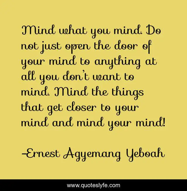 This page presents the quote "Mind what you mind. Do not just open the door of your mind to anything at all you don’t want to mind. Mind the things that get closer to your mind and mind your mind!". Author of this quote is Ernest Agyemang Yeboah. This quote is about negative-thinking, mind-your-mind, thought, action, concentration, mind-power,.