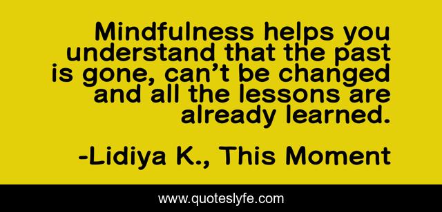 This page presents the quote "Mindfulness helps you understand that the past is gone, can’t be changed and all the lessons are already learned.". Author of this quote is Lidiya K., This Moment. This quote is about mindfulness, zen, present-moment, past, life-lessons, life-philosophy, mind-power, happiness, mindset,.