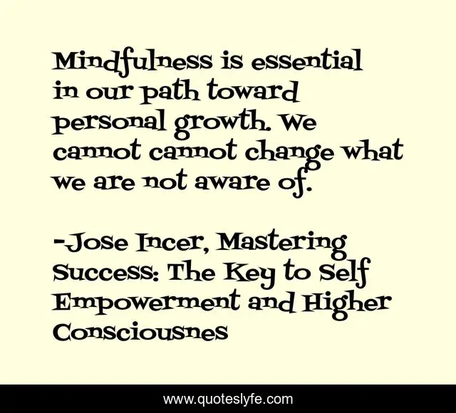 This page presents the quote "Mindfulness is essential in our path toward personal growth. We cannot cannot change what we are not aware of.". Author of this quote is Jose Incer, Mastering Success: The Key to Self Empowerment and Higher Consciousnes. This quote is about mindfulness, awareness, personal-growth,.