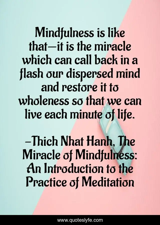 This page presents the quote "Mindfulness is like that—it is the miracle which can call back in a flash our dispersed mind and restore it to wholeness so that we can live each minute of life.". Author of this quote is Thich Nhat Hanh, The Miracle of Mindfulness: An Introduction to the Practice of Meditation. This quote is about live-in-the-moment, mindfulness,.
