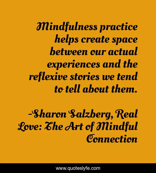 This page presents the quote "Mindfulness practice helps create space between our actual experiences and the reflexive stories we tend to tell about them.". Author of this quote is Sharon Salzberg, Real Love: The Art of Mindful Connection. This quote is about meditation, mindfulness-practice, mindfulness,.