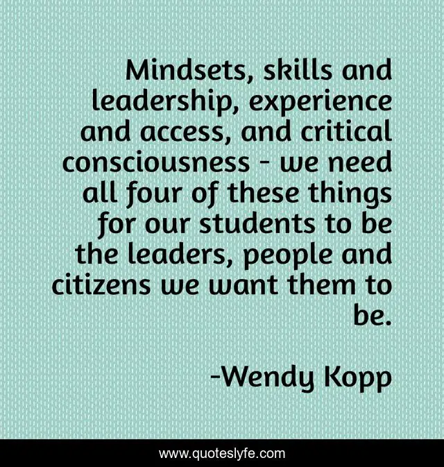 "Wendy Kopp Quotes." Quoteslyfe.com, 2025. Sat. 06 Dec. 2025. <https://www.quoteslyfe.com/quote/Mindsets-skills-and-leadership-experience-and-access-308605>.