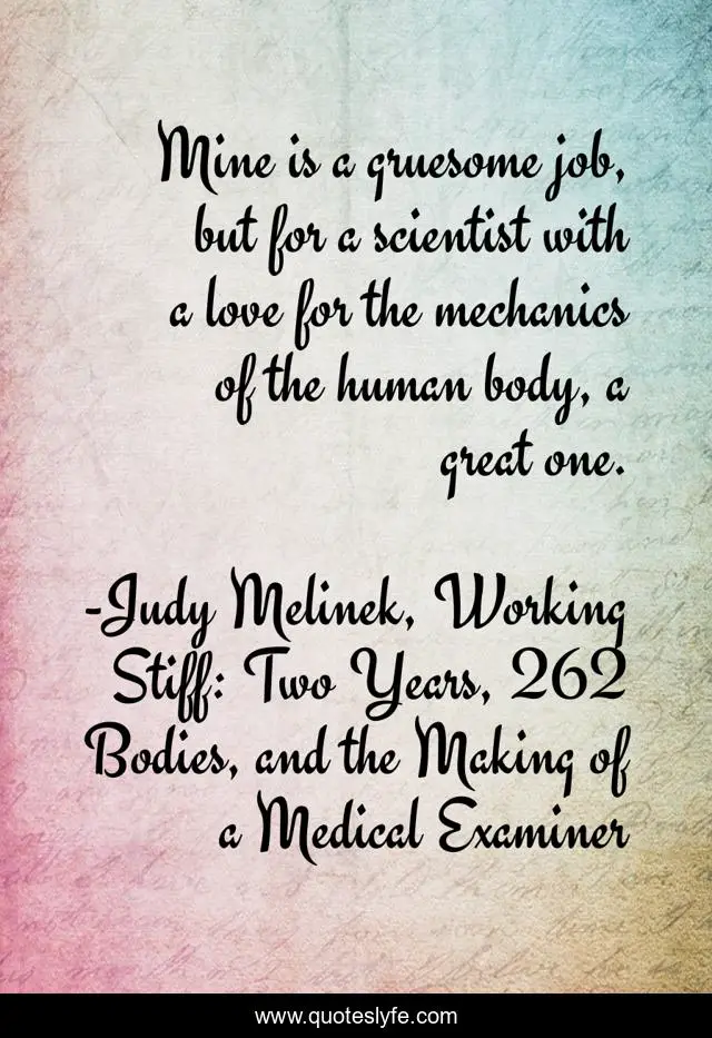 This page presents the quote "Mine is a gruesome job, but for a scientist with a love for the mechanics of the human body, a great one.". Author of this quote is Judy Melinek, Working Stiff: Two Years, 262 Bodies, and the Making of a Medical Examiner. This quote is about death, science, forensics, health, medicine, memoir,.