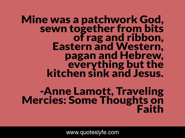 This page presents the quote "Mine was a patchwork God, sewn together from bits of rag and ribbon, Eastern and Western, pagan and Hebrew, everything but the kitchen sink and Jesus.". Author of this quote is Anne Lamott, Traveling Mercies: Some Thoughts on Faith. This quote is about god, religion,.