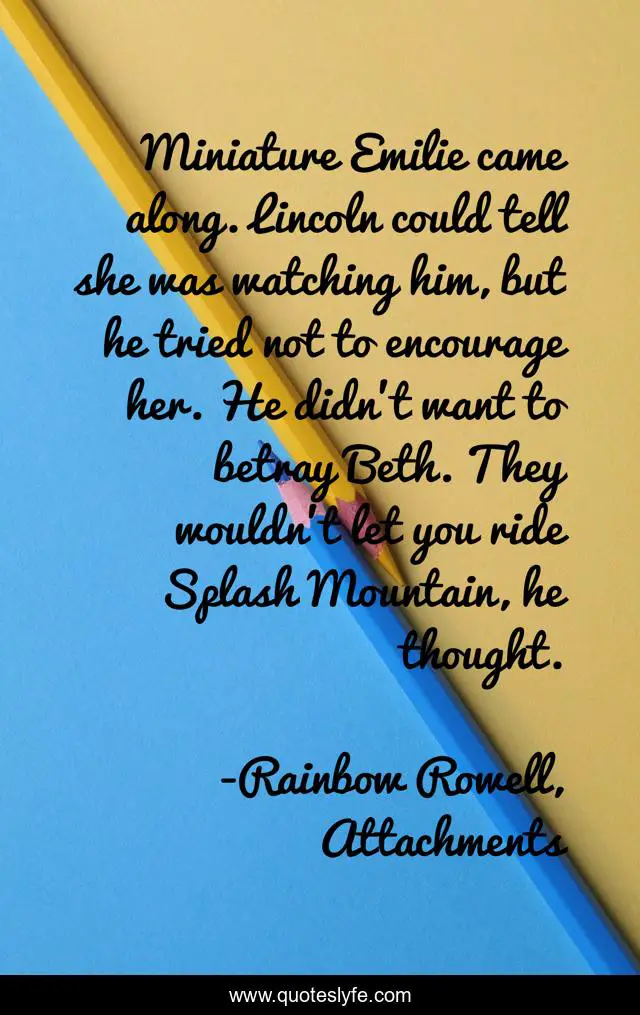 This page presents the quote "Miniature Emilie came along. Lincoln could tell she was watching him, but he tried not to encourage her. He didn't want to betray Beth. They wouldn't let you ride Splash Mountain, he thought.". Author of this quote is Rainbow Rowell, Attachments. This quote is about funny, comedy, faithfulness, hilarious,.