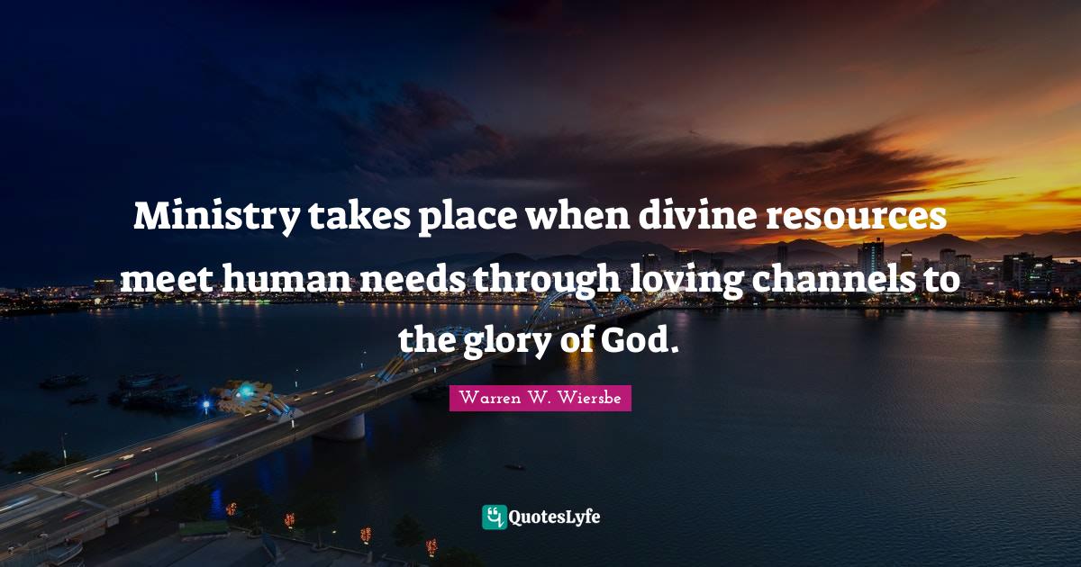 This page presents the quote "Ministry takes place when divine resources meet human needs through loving channels to the glory of God.". Author of this quote is Warren W. Wiersbe. This quote is about ministry, resources, divine, needs, glory of god, glory,.