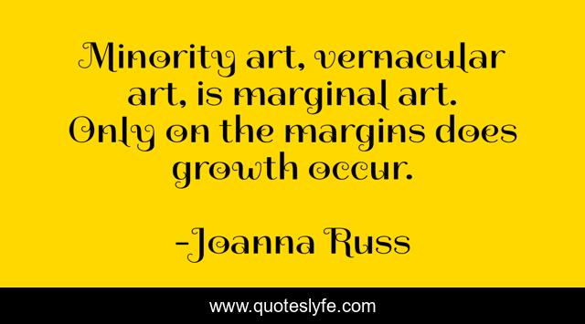 This page presents the quote "Minority art, vernacular art, is marginal art. Only on the margins does growth occur.". Author of this quote is Joanna Russ. This quote is about joanna-russ, growth, art, minority, vernacular,.