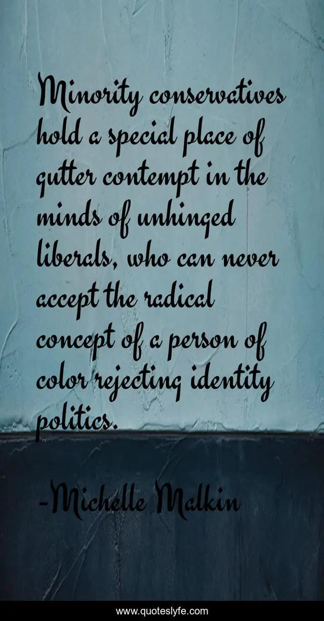 This page presents the quote "Minority conservatives hold a special place of gutter contempt in the minds of unhinged liberals, who can never accept the radical concept of a person of color rejecting identity politics.". Author of this quote is Michelle Malkin. This quote is about identity-politics, liberal, minority, liberals, race, conservatism, conservatives, politics,.