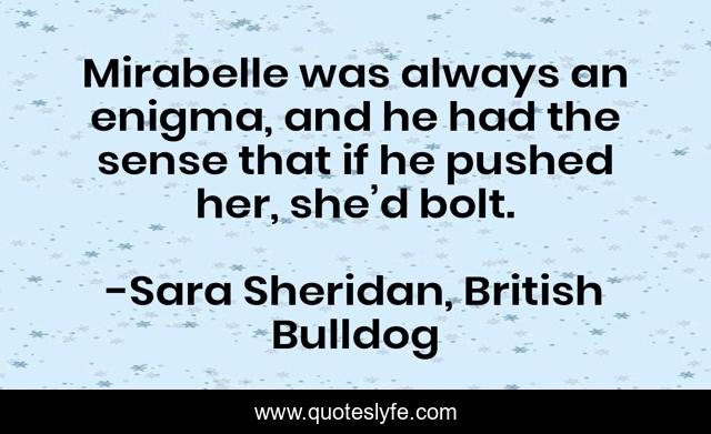 This page presents the quote "Mirabelle was always an enigma, and he had the sense that if he pushed her, she’d bolt.". Author of this quote is Sara Sheridan, British Bulldog. This quote is about mystery, mirabellebevan, enigma, sara-sheridan,.