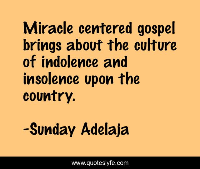 This page presents the quote "Miracle centered gospel brings about the culture of indolence and insolence upon the country.". Author of this quote is Sunday Adelaja. This quote is about country, miracle, culture, miracle-centered-gospel, indolence, insolence,.