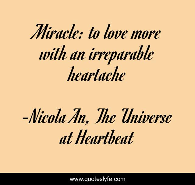 "Nicola An, The Universe at Heartbeat Quotes." Quoteslyfe.com, 2025. Fri. 05 Dec. 2025. <https://www.quoteslyfe.com/quote/Miracle-to-love-more-with-an-irreparable-22326>.